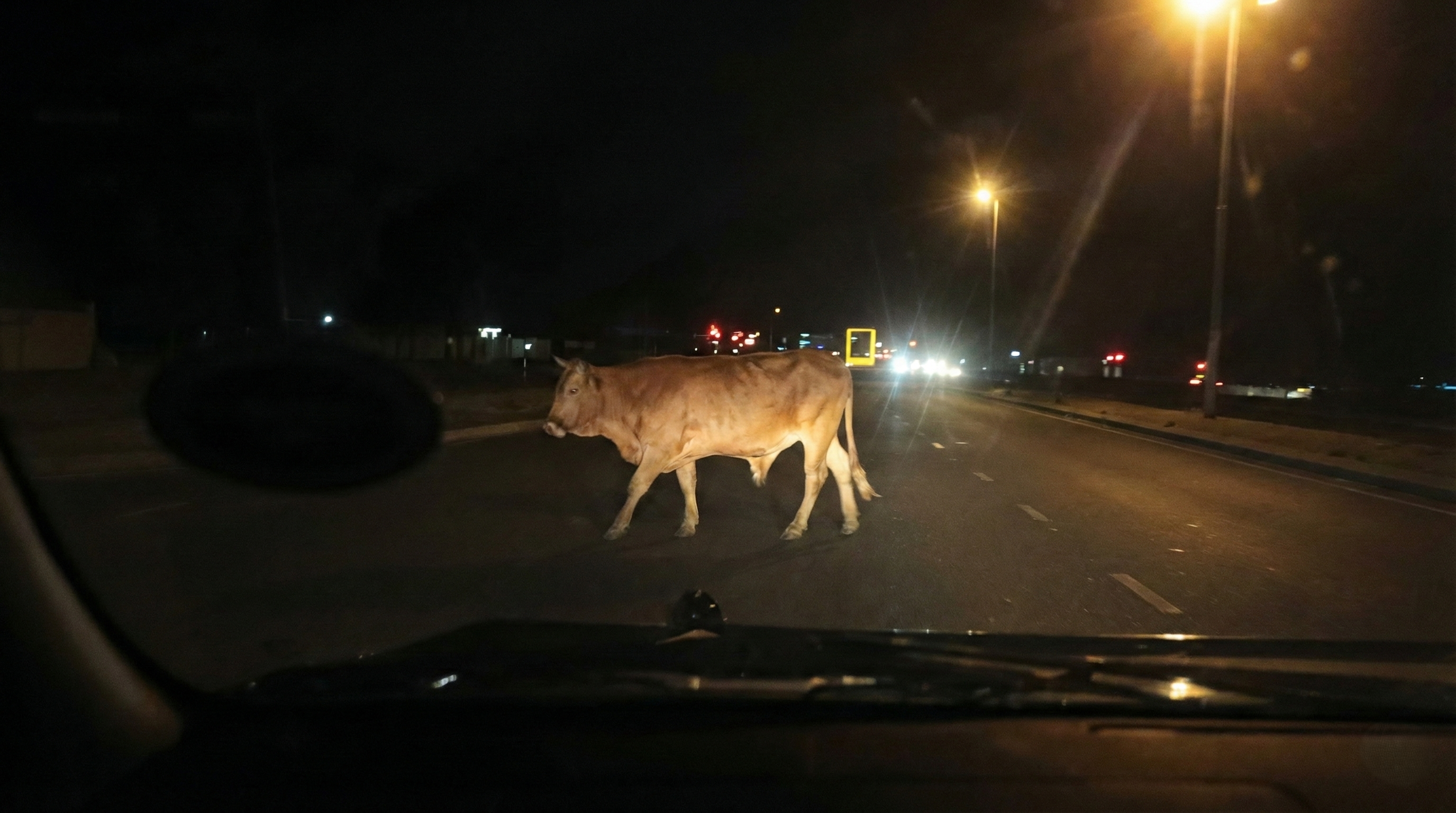 Example: cow detected with 0.94 confidence. Vision-AI alerts the driver.